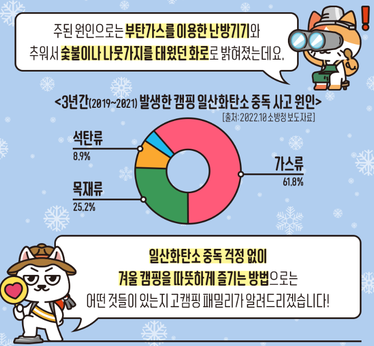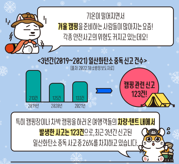 요즘 다들 캠핑 너무 좋아하고 즐겨하는 분들이 아주 많습니다. 그런데 겨울철 캠핑은 안전사고의 위험이 크다고 하니 겨울캠핑 지켜야 하는 안전 수칙 잘 보시고 사고없는 캠핑 즐기시기 바랍니다.