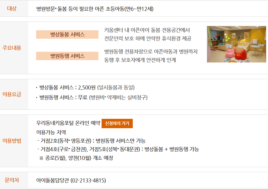 틈새 보육SOS서비스 아픈아이 돌봄공간 병원동행 서비스 신청하러 가기 |