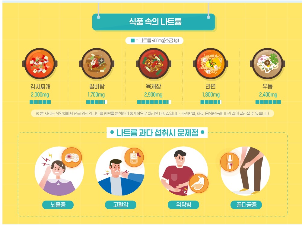 나트륨을 과하게 섭취하는 것은 우리 몸에도 좋지 않습니다. 우리 몸의 필수 성분인 나트륨은 작은 양으로도 체내작용을 하는데 충분하다고 하니 나트륨 줄이기를 실천해 보세요~