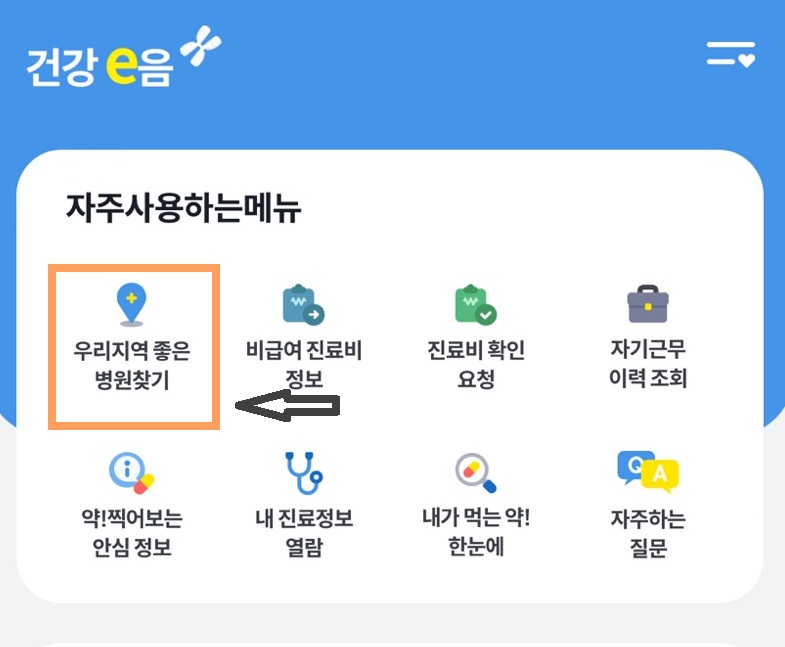 어플 앞에 보시면 우리지역 좋은 병원 찾기를 눌러서 들어가면 찾으실 병원이나 약국의 이름을 적고 검색하면 됩니다.