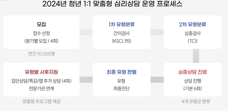 - 일반군으로 확인된 청년들에게는 집단상담 커뮤니티, 마음특강, 마음건강 앱 등의 프로그램 제공